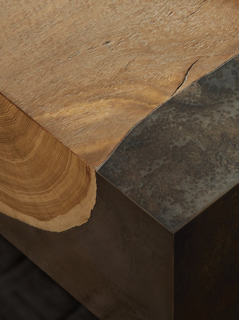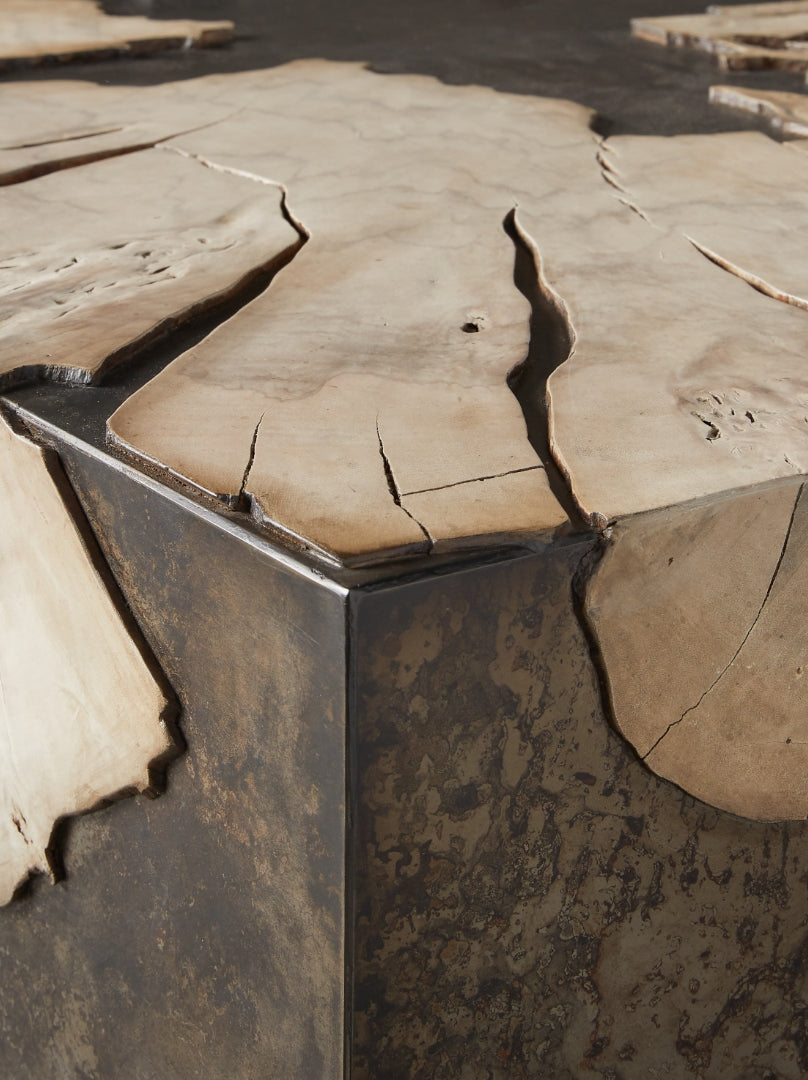 Panels of weathered steel mold around silhouettes of yukas, celebrating organic imperfection.